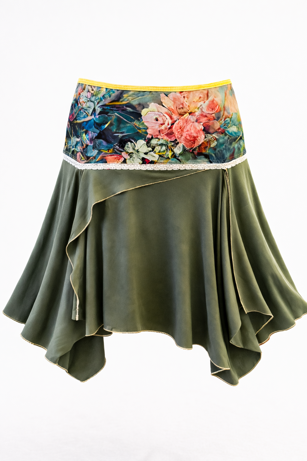 Pizzetka "TANEC JARA" je taková hravá, volná sukně, která okamžitě přitahuje pohyb a lehkost. Má cípatý střih – to znamená, že její okraje vytvářejí jemné špičky a vrstvené linie, které při kroku, otočení nebo tanci krásně vlají a rozehrávají se jako okvětní lístky ve větru. Není to jen obyčejná krátká sukně, ale živý kus látky, který nás zve k radosti, svobodě a trochu té jarní hravosti.